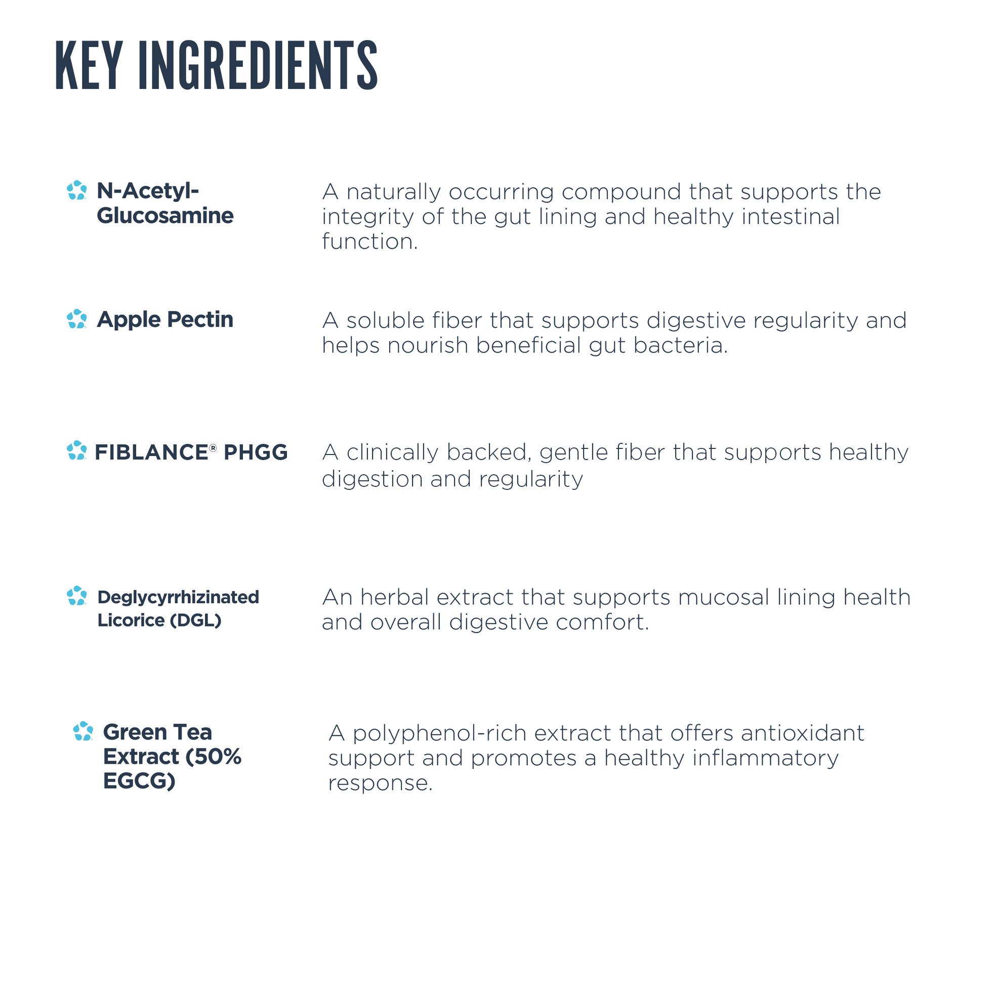 GI+ contains nutrients that support the integrity of the gut lining*, display protective effects on gastric mucosa and gut environment*, promote the growth of healthy gut bacteria, and support GI immune function